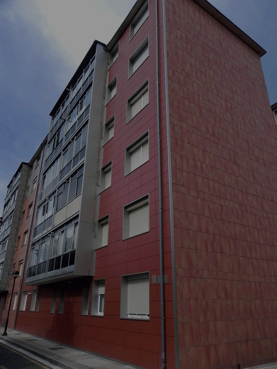 La particularidad de esta obra en el Barrio de Bideaur nº4 de Amorebieta (Bizkaia), reside en las patologías derivada de la instalación de una fachada ventilada, para la solución definitiva, se opto por desmontar la fachada ventilada existente, la realización de tapado y arreglo con albañilería de diferentes encuentros interiores, la colocación de una nueva fachada ventiladas de gres porcelanico, un aislamiento, y unos remates en composite, así como el forrado de los miradores con panel composite.