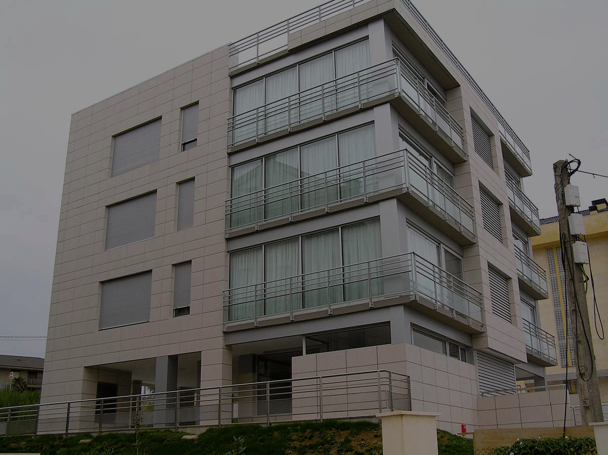 Fachadas de gres porcelanico y composite con anclaje visto y mochetas en el mismo material.
